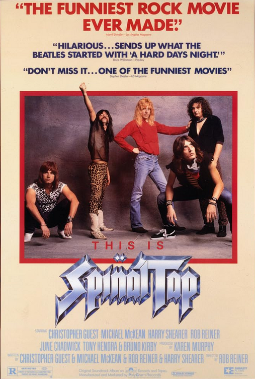 Infine, l’Hard Rock fornì il materiale perfetto anche per la satira: il finto documentario “This Is Spinal Tap” (1984) di Rob Reiner immortalò i cliché e la comicità involontaria del circo rock, creando un archetipo di band rock esagerata che continua a influenzare la commedia. Il film è strutturato come un finto documentario diretto da Marty DiBergi (Rob Reiner), che segue la band fittizia britannica Spinal Tap (inizialmente un gruppo folk, poi psichedelico, e infine heavy metal) durante un disastroso tour negli Stati Uniti per promuovere il loro nuovo album, “Smell the Glove”. Il film satireggia in modo brillante tutti i cliché e le assurdità del mondo del rock, tra cui ego smisurati, le rivalità e le incomprensioni tra il duo centrale, David St. Hubbins e Nigel Tufnel. Concerti cancellati all’ultimo minuto, setlist sbagliate e difficoltà a trovare il palco. Richieste assurde nel backstage, scenografie ridicole, come il famoso dolmen in miniatura e, l’ossessione per il volume. Una gag ricorrente e centrale è il fatto che tutti i batteristi precedenti della band sono morti in circostanze bizzarre e stupide. Se non l’avete visto, recuperatelo subito.