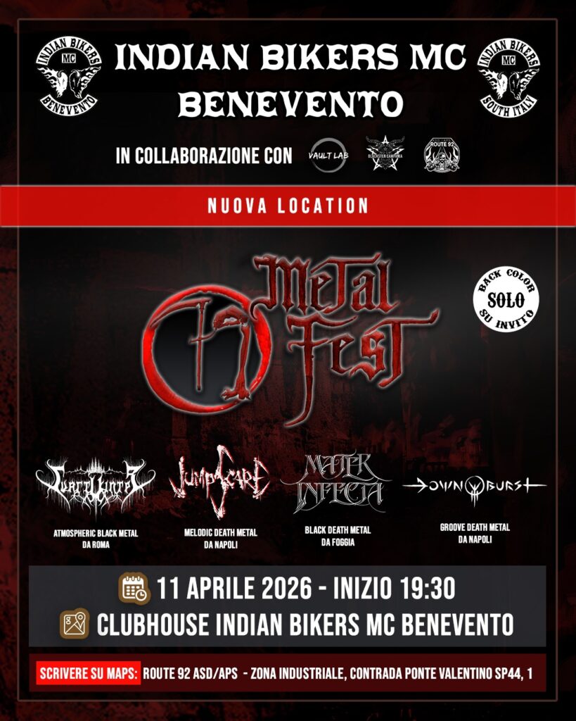 Per ragioni logistiche non dipendenti dalla volontà degli organizzatori, il 71 Metal Fest cambia ufficialmente location e si terrà presso la Clubhouse Indian Bikers MC di Benevento, nuova casa di una serata che si preannuncia come uno degli appuntamenti più intensi della scena underground campana.