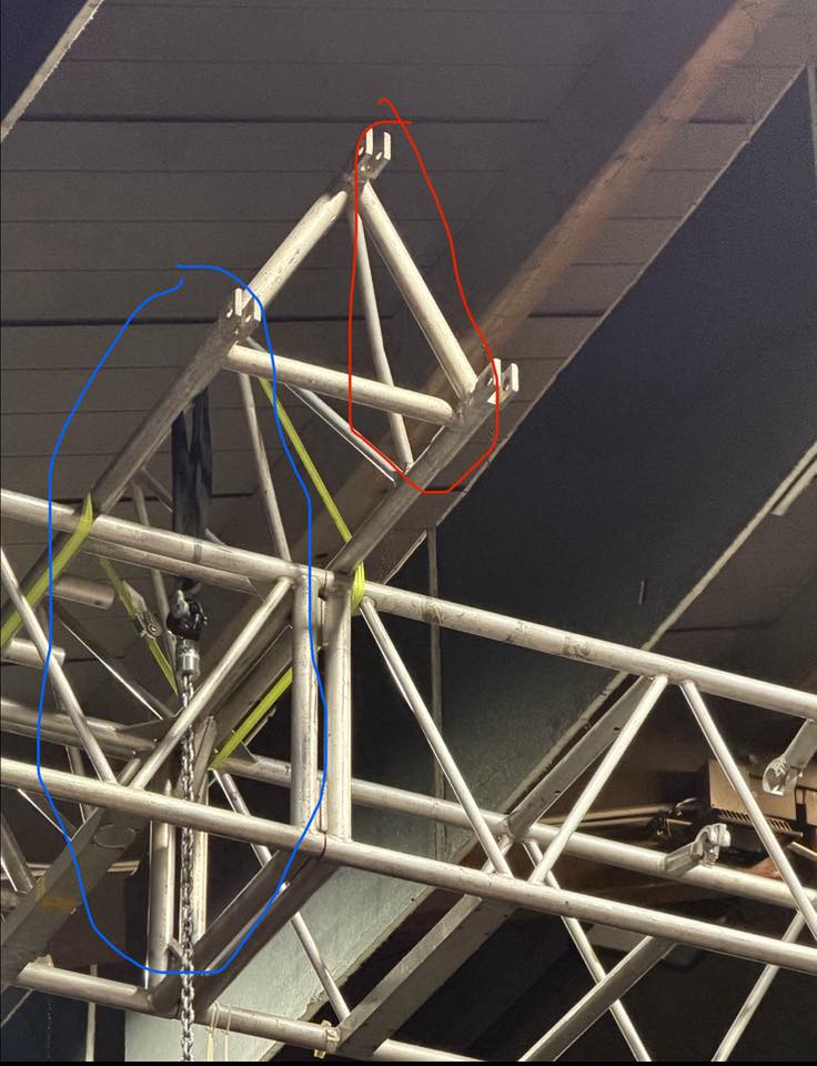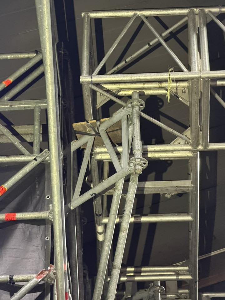 Durante l’ispezione abbiamo inoltre notato che il traliccio principale non faceva un contatto corretto con i suoi punti di ancoraggio. La soluzione proposta dalla venue è stata un pezzo di compensato avvolto con nastro isolante, che è stato definito “sicuro” e “sufficiente”. Invece non lo era.