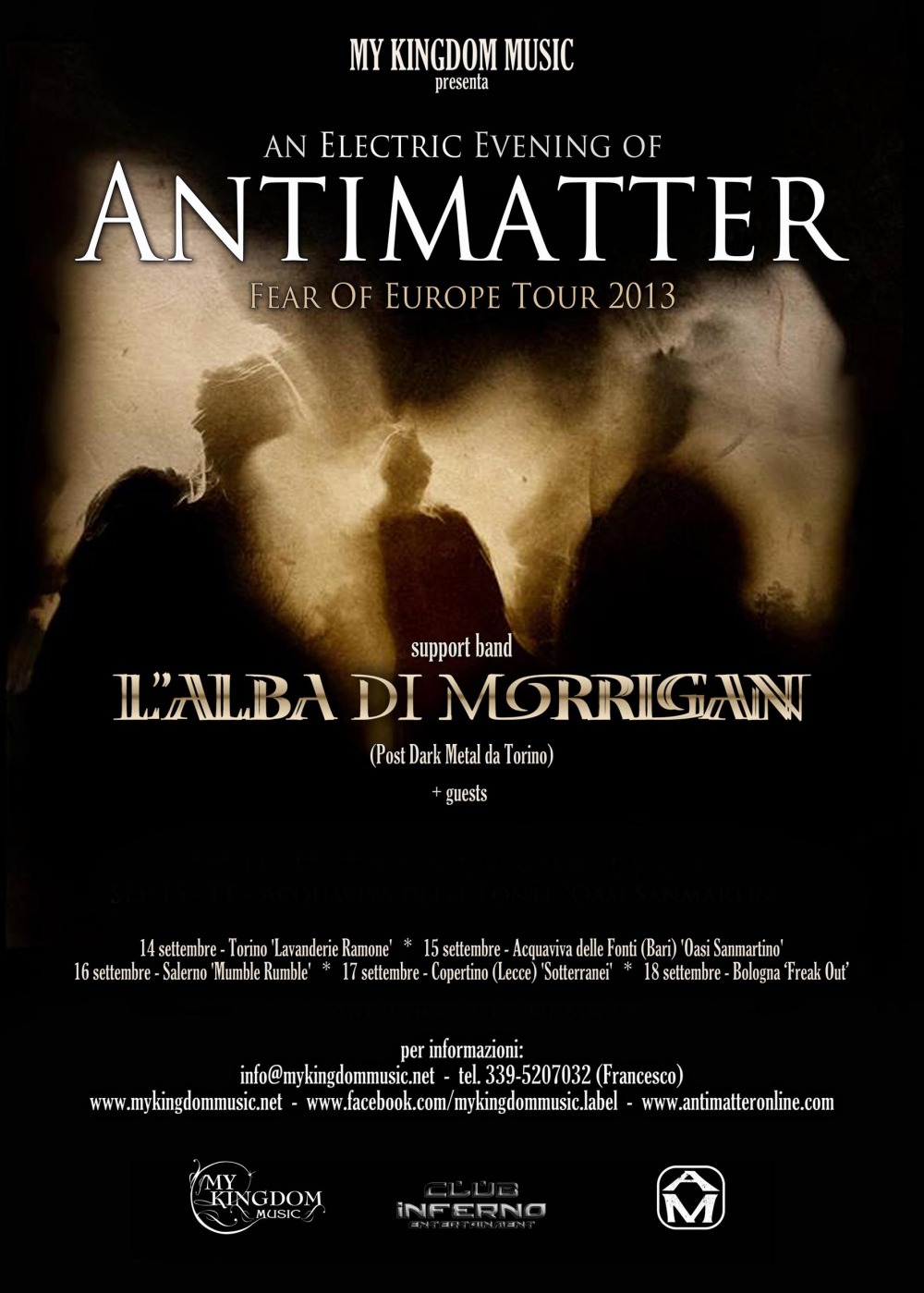 MY KINGDOM MUSIC in collaborazione con Club Inferno Ent. e Aftermath Booking presenta l’esclusivo tour italiano degli inglesi ANTIMATTER che saranno accompagnati dai torinesi L’ALBA DI MORRIGAN e che si terrà in 5 date dal 14 al 18 settembre.