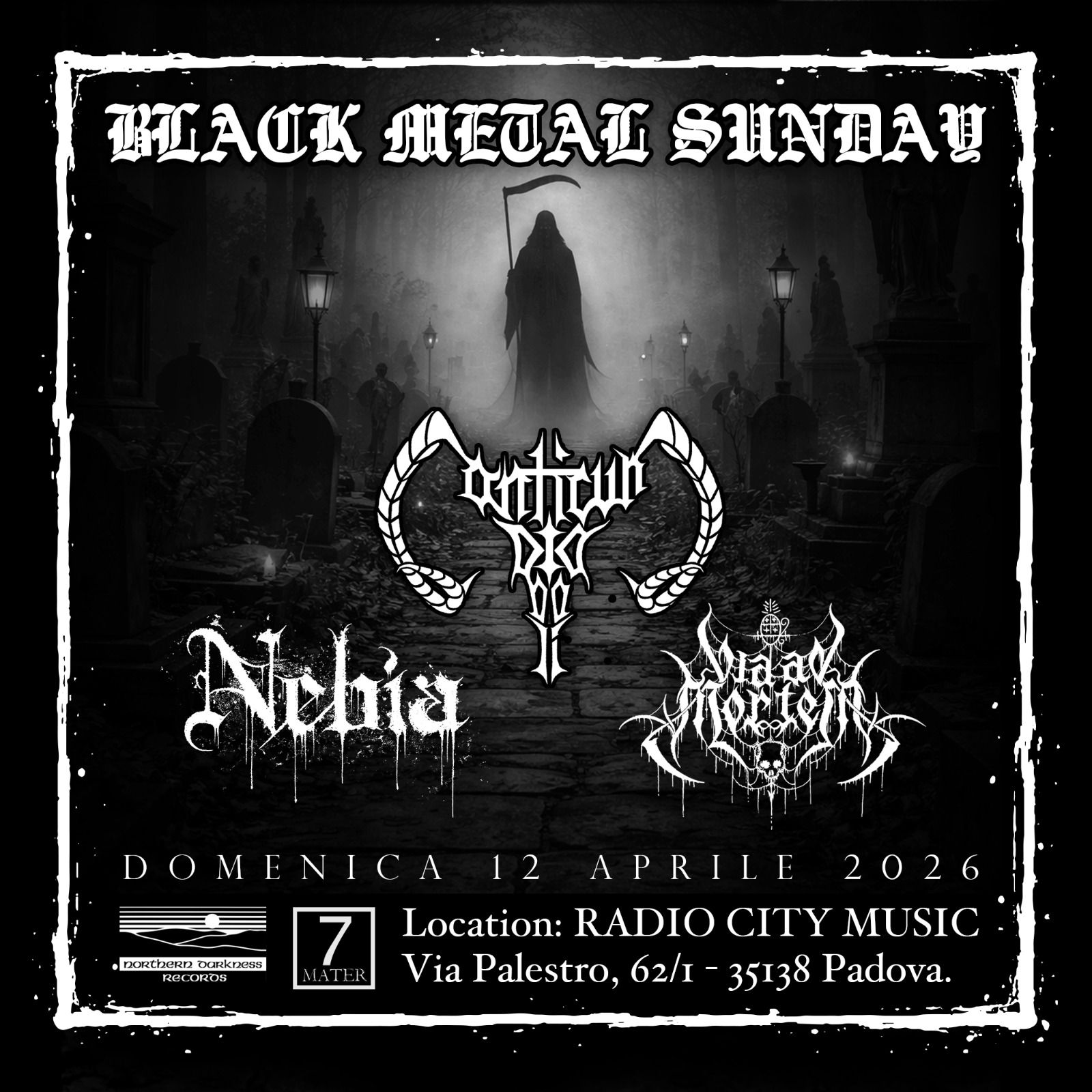 VIA AD MORTEM sono una nuova realtà del black metal italiano. Sarà presentato durante il live l’album di debutto “Requiem I: Through the Path Over The Ruins” che si muove tra la furia primordiale di Spite Extreme Wing e le atmosfere contemplative di Drudkh. Il progetto affonda le proprie radici nel concetto di morte, non soltanto come evento fisico, ma come dissoluzione spirituale e intellettuale. Tradizioni esoteriche, cicli cosmici, necromanzia e rifiuto del modernismo si intrecciano in una visione sincretica che evita dogmi e sentenze. “Requiem I: Through the Path Over The Ruins” non pretende di insegnare: vuole evocare. Nel caos del materialismo contemporaneo, Via ad Mortem riaffermano il black metal come arte, spiritualità e filosofia. I Via Ad Mortem fanno parte del roster di Northern Darkness per tali motivi.