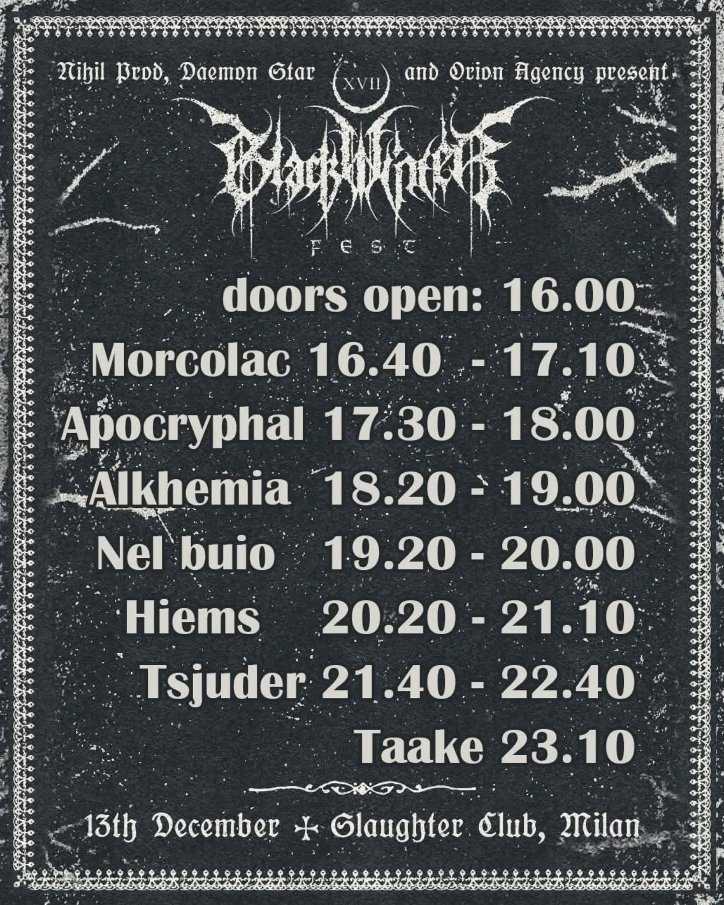 Nihil Prod, Daemon Star e Orion Agency presentano la diciassettesima edizione del Black Winter Fest, che si terrà come di consueto allo Slaughter Club di Paderno Dugnano (MI).