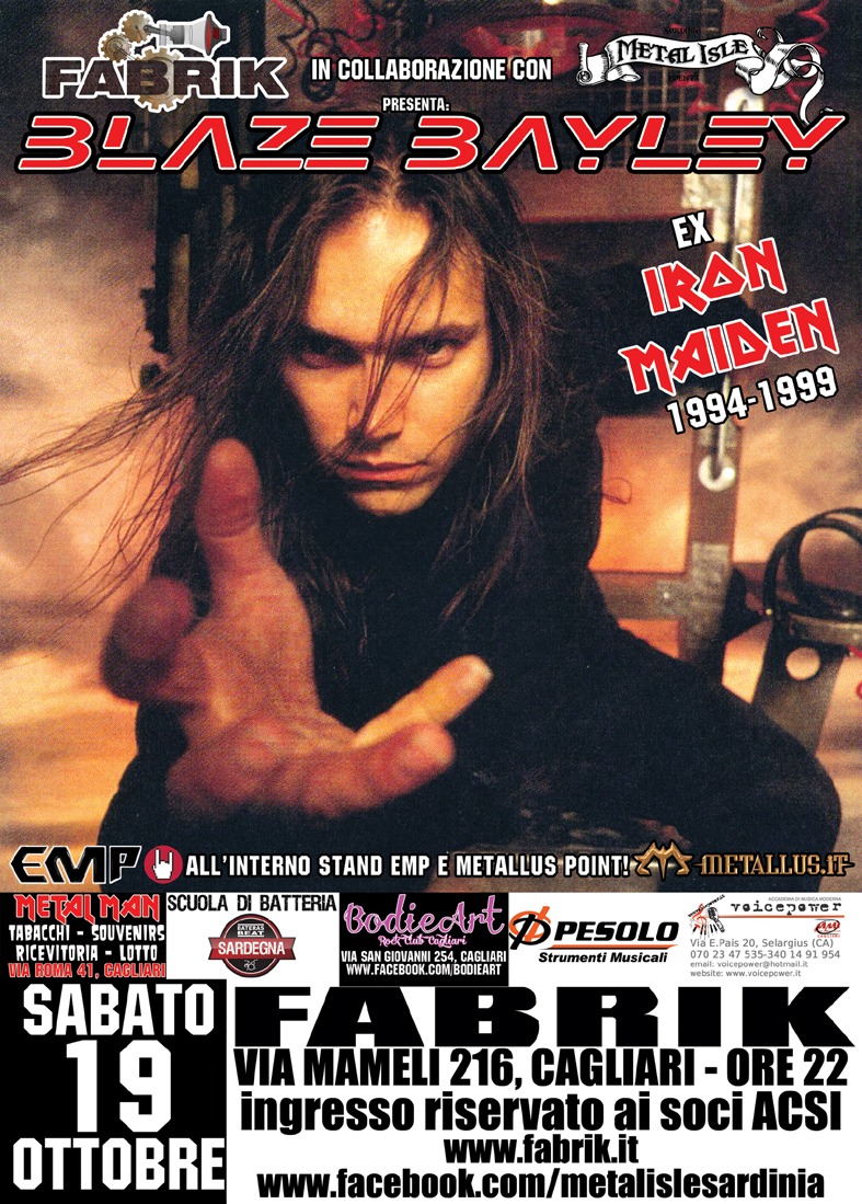 Per la seconda volta in Sardegna e per la prima volta a Cagliari, arriva sul palco del FABRIK CLUB per una data del suo tour europeo BLAZE BAYLEY – ex frontman degli IRON MAIDEN con i quali ha inciso “The Factor X” nel 1995 e “Vitual XI” nel 1998 e attuale singer dei WOLFSBANE – in cui presenterà il suo ultimo album, “Soundtracks Of My Life”, in uscita ad ottobre e riproporrà diversi grandi classici degli Iron Maiden.