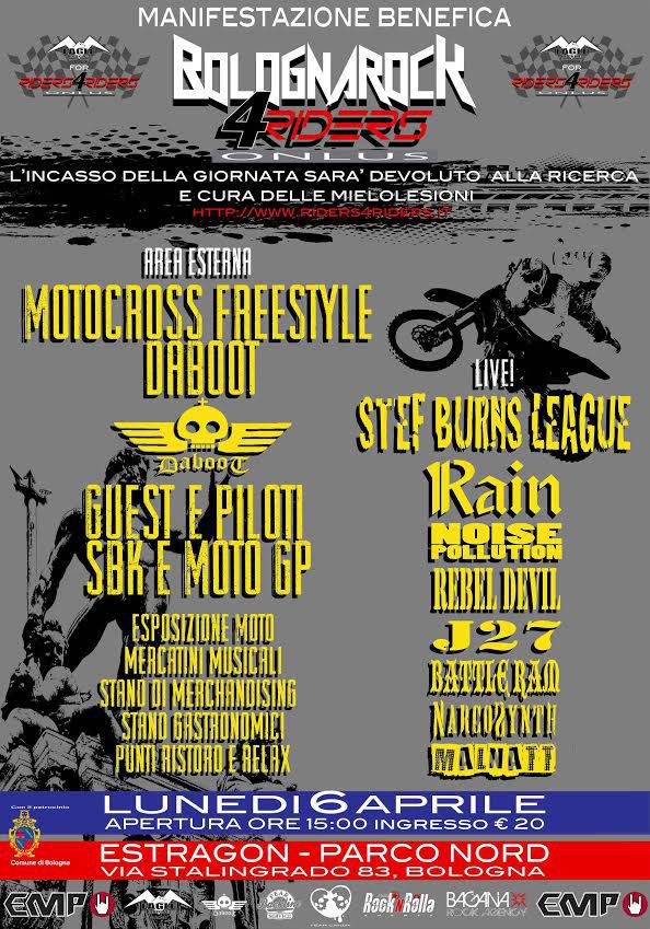 BOLOGNA ROCK 4 RIDERS è una manifestazione di beneficenza il cui incasso sarà devoluto all’associazione RIDERS4RIDERS, Onlus fondata nel 2010 da piloti ed appassionati delle due ruote con la finalità di raccogliere fondi per assistere riders/piloti gravemente infortunati e di sostenere la ricerca per la cura delle mielolesioni.