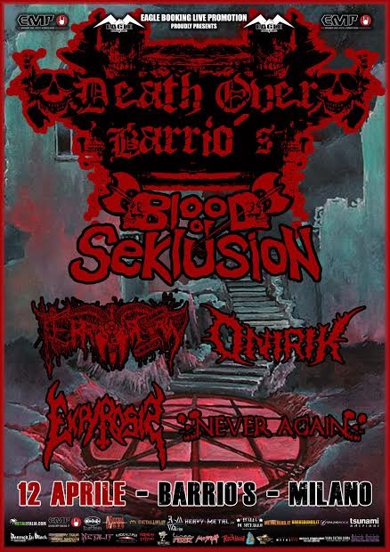 A capitanare il bill troveremo i BLOOD OF SEKLUSION che insieme adONIRIK, TERRORSAW, EKPYROSIS e NEVER AGAIN, renderanno la serata un evento unico ed assolutamente da non perdere per tutti gli amanti del genere.