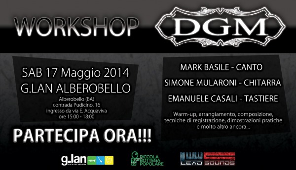 SI RICORDA che nel pomeriggio, dalle ore 15:00 alle ore 18:00, sempre presso i laboratori G.Lan di Alberobello, avranno luogo i workshop di canto, chitarra e tastiere, tenuti dai membri dei DGM!
