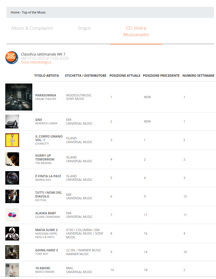 Da segnalare che la classifica FIMI comprende sia gli acquisti fisici che gli ascolti nelle varie piattaforme streaming. Sempre stando ai dati FIMI, per quanto riguarda il solo supporto fisico, “Parasomnia” è il disco più acquistato in Italia nella settimana numero 07/2025. Un risultato davvero degno di nota.
