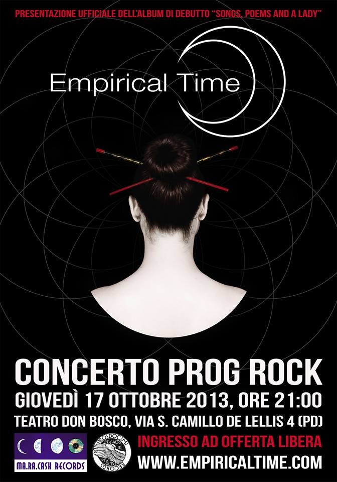 Pubblicato dalla Ma.ra.cash Records, Songs, Poems and a Lady guarda ai classici del genere, agli ineludibili Pink Floyd, Genesis e ELP, ma gli Empirical Time cercano di mostrare la propria personalità, soprattutto dal vivo: “L’impostazione dei nostri live è caratterizzata da un più ampio spazio dedicato all’improvvisazione e alla possibilità di espressione dei singoli componenti, in modo che il contatto tra il pubblico e i musicisti sia il più vivo e pulsante possibile. Le nostre esperienze live contribuiscono inoltre alla continua evoluzione dei pezzi e alla ricerca del suono”. Il disco sarà presentato in concerto giovedì 17 ottobre al Teatro Don Bosco (Via S. Camillo De Lellis, 4) di Padova; il concerto successivo si svolgerà invece all’Ex Euro Bar di Roana (VI) sabato 26 ottobre.