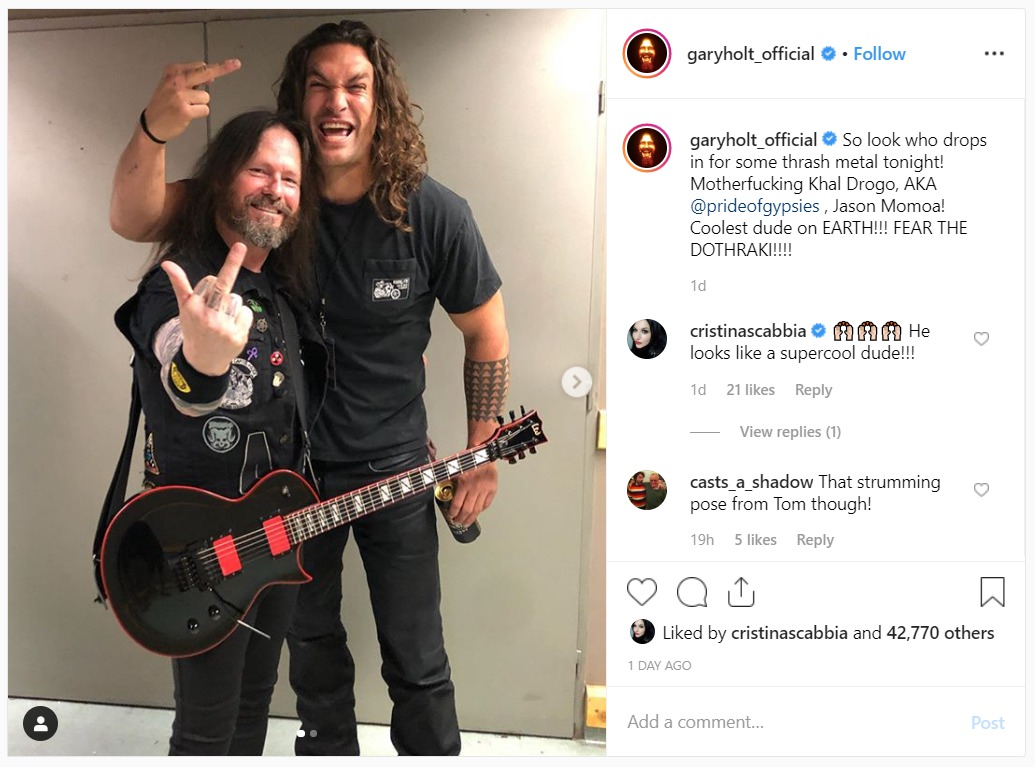 L’attore Jason Momoa, noto per il ruolo di Khal Drogo nella serie Game of Thrones, ha incontrato Slayer e Anthrax al concerto di Budapest di alcuni giorni fa.