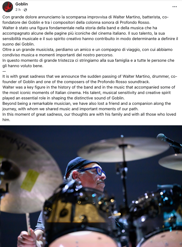 “Con grande dolore annunciamo la scomparsa improvvisa di Walter Martino, batterista, co-fondatore dei Goblin e tra i compositori della colonna sonora di Profondo Rosso.Walter è stato una figura fondamentale nella storia della band e della musica che ha accompagnato alcune delle pagine più iconiche del cinema italiano. Il suo talento, la sua sensibilità musicale e il suo spirito creativo hanno contribuito in modo determinante a definire il suono dei Goblin.Oltre a un grande musicista, perdiamo un amico e un compagno di viaggio, con cui abbiamo condiviso musica e momenti importanti del nostro percorso.In questo momento di grande tristezza ci stringiamo alla sua famiglia e a tutte le persone che gli hanno voluto bene.”