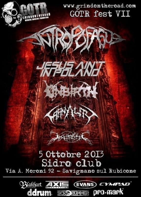 Come ogni anno Grind On The Road si proporrà di raccogliere alcune delle realtà italiane più interessanti del panorama death metal nazionale. Headliner di questa settima edizione saranno i genovesi Antropofagus (Comatose Music). Prima di loro si esibiranno anche i Jesus Ain’t in Poland, gli Unbirth, i Carnality e i Discordance. L’appuntamento è sabato 5 ottobre 2013 dalle ore 20.00 al Sidro Club di Savignano sul Rubicone (FC). Gr…ind on!