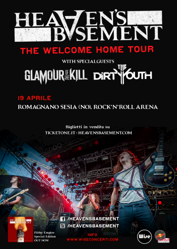 La gavetta degli HEAVEN’S BASEMENT è stata sicuramente lunga e tortuosa: dopo anni di vita on the road al seguito di bands quali Bon Jovi, Alter Bridge, Papa Roach, Black Veil Brides e Seether, ed aver partecipato a festivals di prestigio quali il Download di Donington e l’itinerante Sonisphere, per citarne alcuni, il loro grande momento è finalmente arrivato.HEAVEN’S BASEMENT, a seguito del loro disco d’esordio (“Filthy Empire”, Red Bull Rec.), intraprenderanno nella primavera del 2014 un tour in veste di headliner! A celebrare la grande occasione, la band inglese ha deciso di invitare gli amici GLAMOUR OF THE KILLTHE DIRTY YOUTH a condividere il palco per tuttte le date europee. L’unico appuntamento per i tanti fans italiani di HEAVEN’S BASEMENT è fissato per Sabato 19 Aprile 2014 alla Rock’n’Roll Arena di Romagnano Sesia (NO).