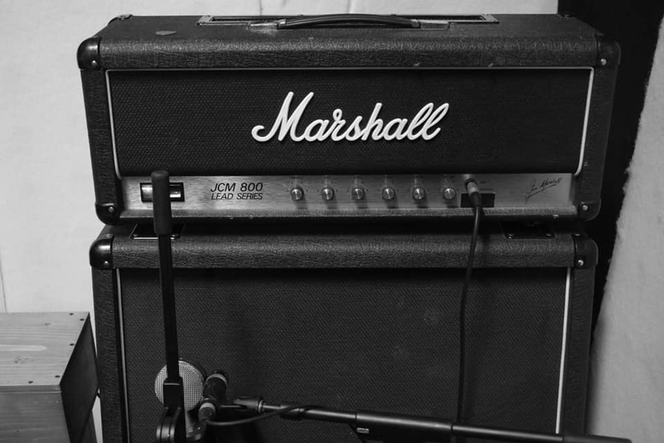 – Testata Marshall JCM800 2203 reissue, manca l’input low gain ed il buco è stato coperto con del nastro nero. Qualche graffio al tolex nella parte superiore e sul fianco. Nello chassis c’è un buco perchè un precedente proprietario aveva aggiunto una valvola di preamp, poi tolta da me. Rimossa circuitazione send/return e modificato BIAS.