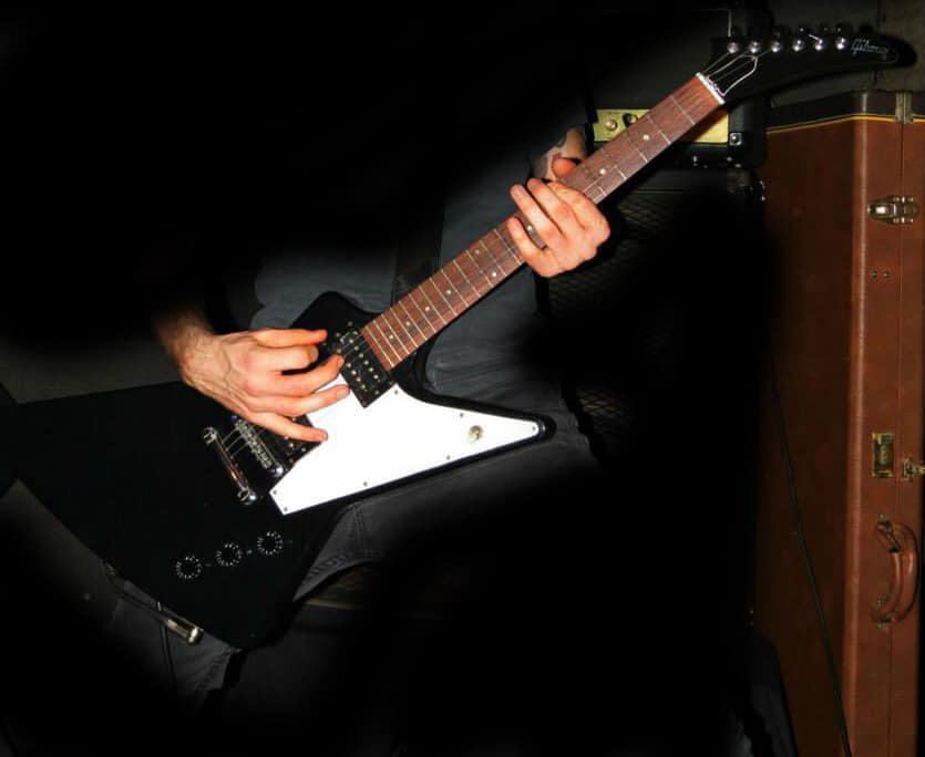 – Gibson Explorer Made in USA 1991 nera con battipenna bianco. Un precedente proprietario aveva scritto BEER sulla coda superiore del body, successivamente rimossa ma visibile ancora in controluce. Il bordo del battipenna è stato colorato di nero. Custodia originale Gibson marrone Made in Canada con adesivo bandiera canadese.