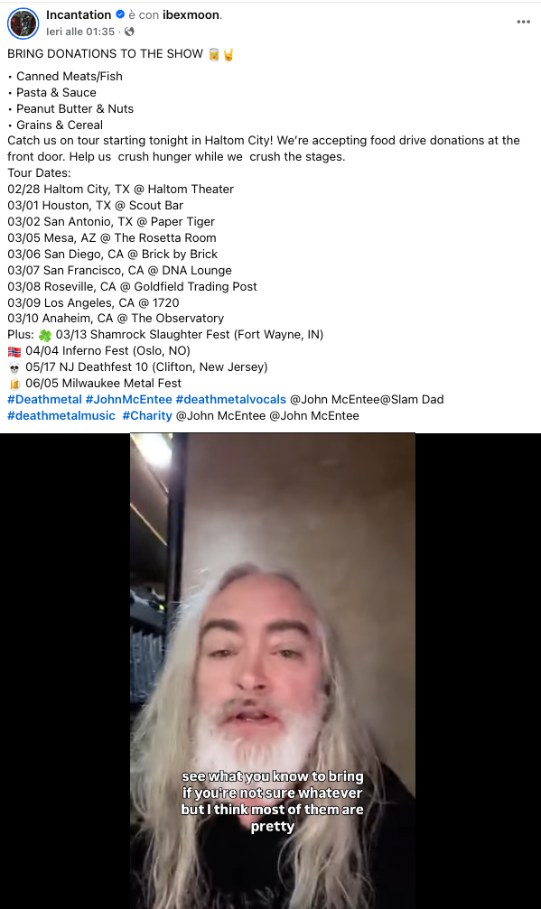 Gli Incantation chiedono aiuto ai propri fan per affrontare l’attuale tour in Nord America, così come riportato da Lambgoat e dai social media della band. Dopo il debutto del 19 febbraio a Brooklyn, sono bastati pochi giorni perché il frontman John McEntee lanciasse un appello sui social: portare acqua e generi alimentari a lunga conservazione come carne e pesce in scatola, pasta e sughi, burro di arachidi e noci, cereali e legumi, alle prossime date del tour.