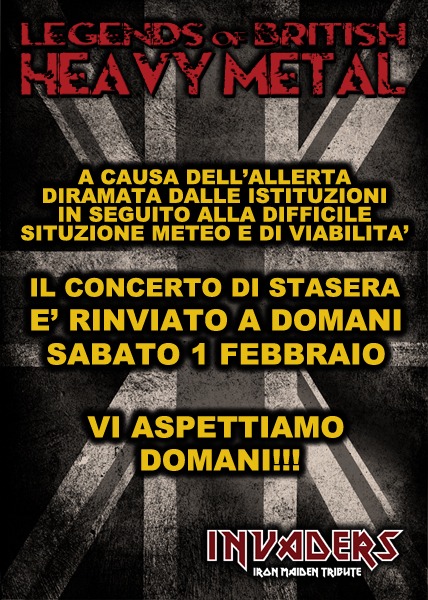 Segnaliamo che l’evento previsto per questa sera “Legends of British Heavy Metal” presso l’Orion club e’ stato posticipato a sabato 1 febbraio 2014 a causa del perdurare delle cattive condizioni meteorologiche nella città di Roma. Orari e costi rimangono invariati.Ci scusiamo per il disagio