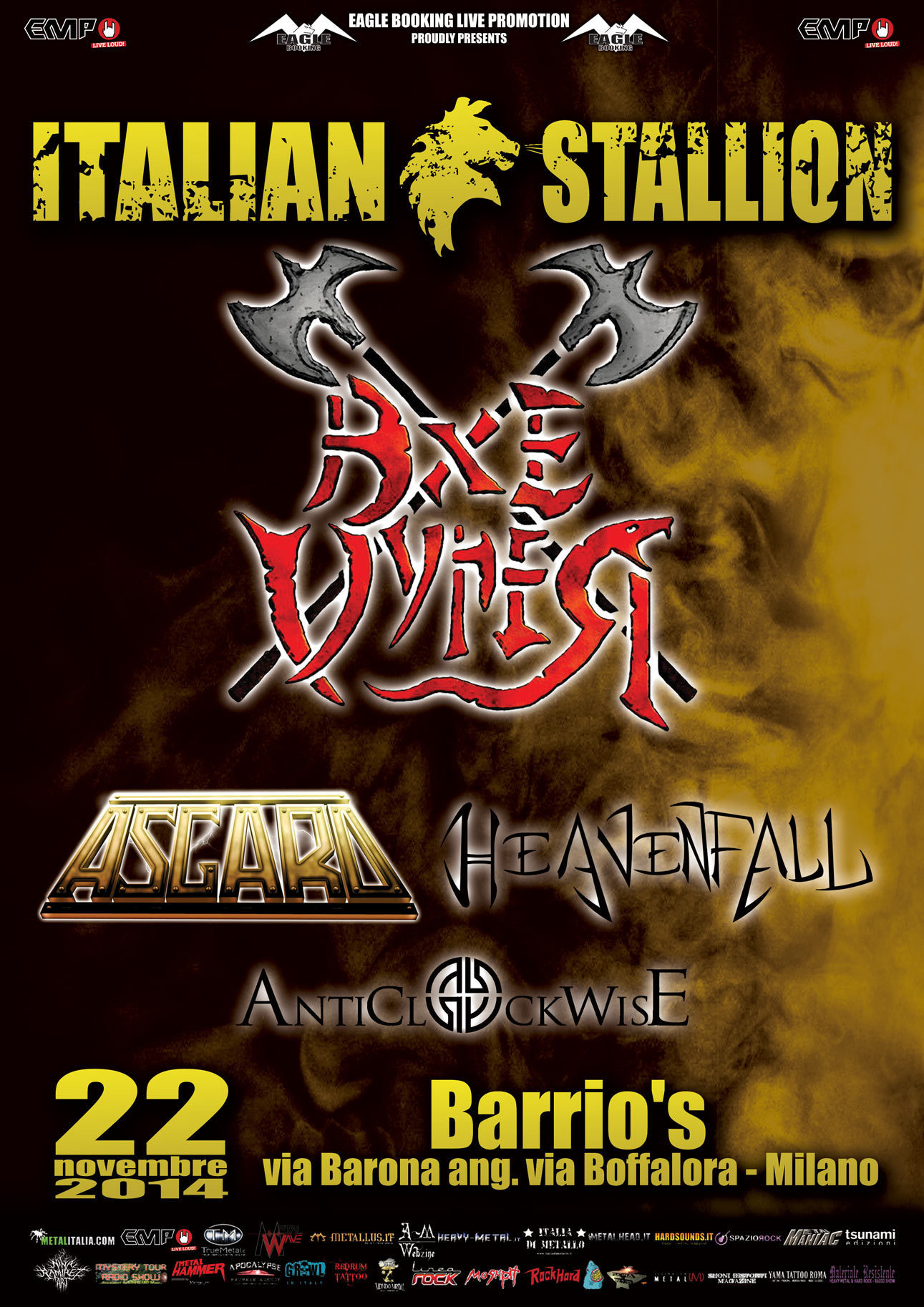 Tutto pronto per l’ITALIAN STALLION, festival heavy metal che vedrà alternarsi 4 tra le migliori realtà che il nostro territorio a generato. AXE VYPER, ASGARD, HEAVENFALL e ANTICLOCKWISE saranno sul palco del Barrio’s di Milano il 22 Novembre 2014.