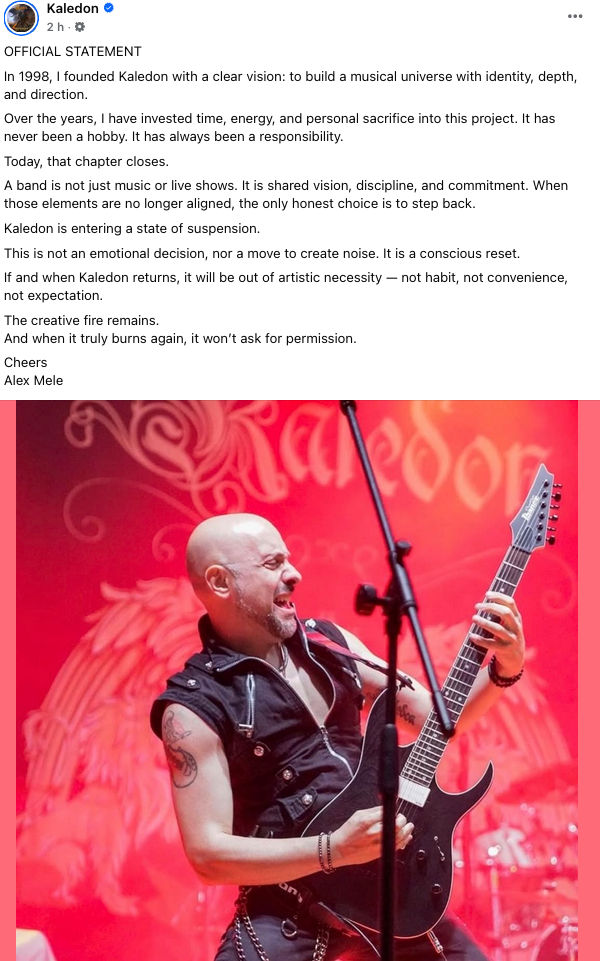 Alex Mele dei Kaledon ha pubblicato sulla pagina ufficiale di Facebook un comunicato in cui annuncia uno stato di sospensione per la band.