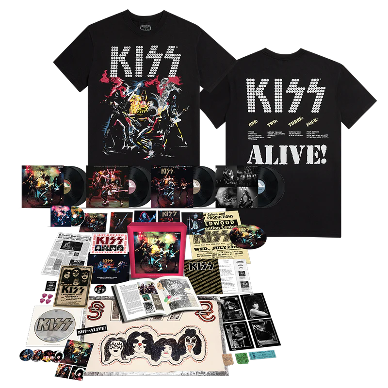 Gli LP 1 e 2 includono l’album originale rimasterizzato da Bernie Grundman a partire dai master stereo analogici originali del 1975. Gli LP dal 3 al 6 includono due concerti completi del tour “Dressed To Kill” del 1975 — RKO Orpheum Theatre a Davenport, Iowa, il 20 luglio, Second Show e Wildwood Convention Hall a Wildwood, New Jersey, il 23 luglio — rimixati dal leggendario produttore e ingegnere del suono Eddie Kramer a partire dai nastri analogici multitraccia originali registrati dai KISS nel 1975, senza sovraincisioni. Le tracce bonus degli LP 7 e 8 includono cinque tracce di prova al concerto di Davenport, tra cui una jam improvvisata, e sei brani aggiuntivi dal Cleveland Music Hall di Cleveland, Ohio, il 21 giugno 1975, tutti rimixati da Eddie Kramer a partire dai nastri analogici multitraccia originali. Il disco Blu-ray Audio contiene “Alive!” recentemente mixato da Eddie Kramer dai nastri analogici multitraccia dell’album originale in Dolby Atmos e surround 5.1 insieme allo stereo appena rimasterizzato in 192 kHz 24 bit e stereo PCM a 96 kHz 24 bit impostato su un nuovissimo visualizzatore con una miniera di foto live inedite.