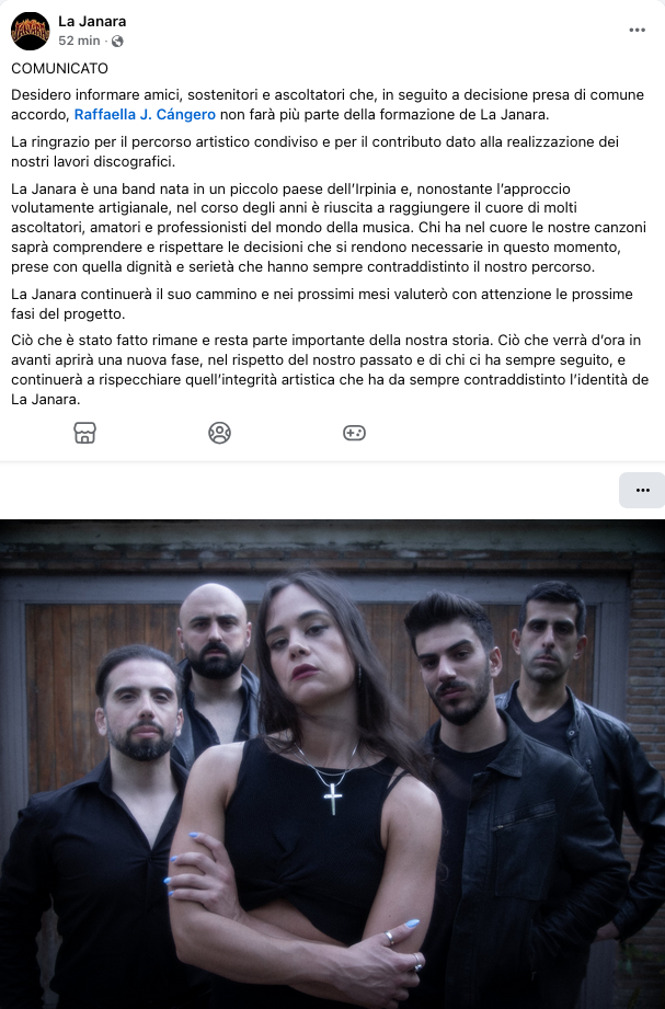 “Desidero informare amici, sostenitori e ascoltatori che, in seguito a decisione presa di comune accordo, Raffaella J. Cángero non farà più parte della formazione de La Janara.