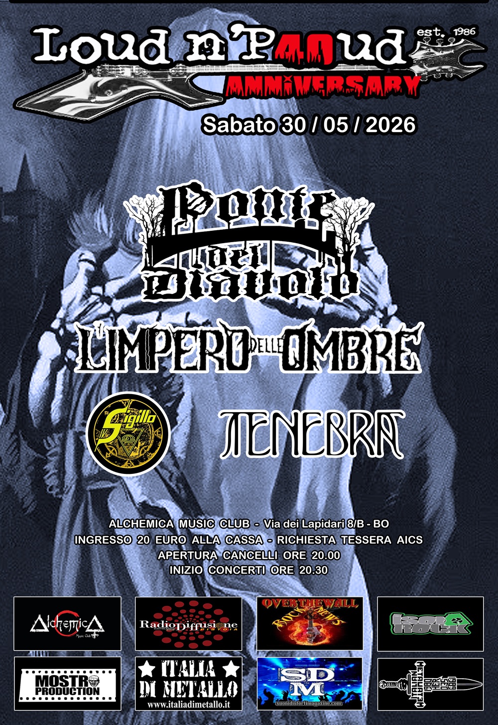 Sabato 30 maggio all’Alchemica di Bologna con Tenebra, IV Sigillo , L’Impero Delle Ombre e Ponte Del Diavolo; tutti insieme per festeggiare uno dei programmi metal più longevi della radiofonia italiana