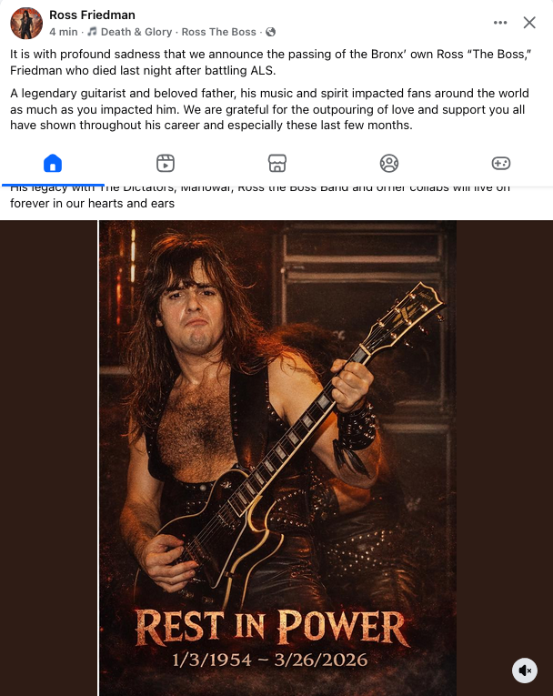 È con profonda tristezza che annunciamo la scomparsa di Ross “The Boss” Friedman, originario del Bronx, venuto a mancare ieri sera dopo aver lottato contro la SLA.