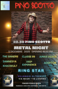 Il prossimo 5 dicembre 2025 a Livorno si terra la Metal Night presso il Villaggio Oltremare di Via Magri 118, un evento organizzato dalla Claps eventi di Vanessa Barbato e Piero Ciantelli.