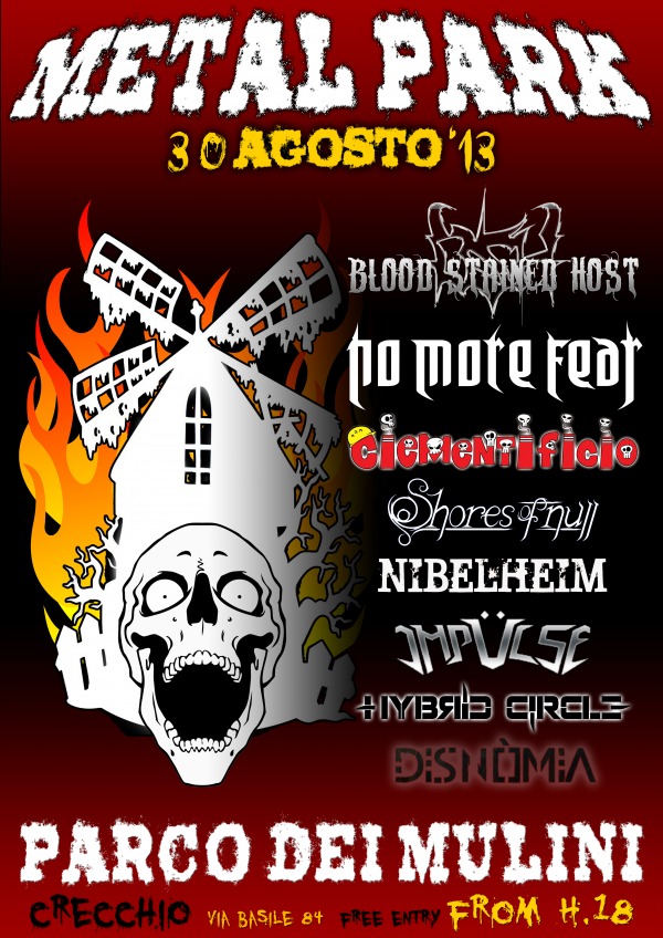 Definita la Bill del “Metal Park”! Il festival si svolgerà a Crecchio (CH) il 30 agosto e vedrà alternarsi sul palco le seguenti band: Blood Stained Host, No More Fear, Ciementificio, Shores Of Null, Nibelheim, Impulse, Hybrid Circle e Disnomia.