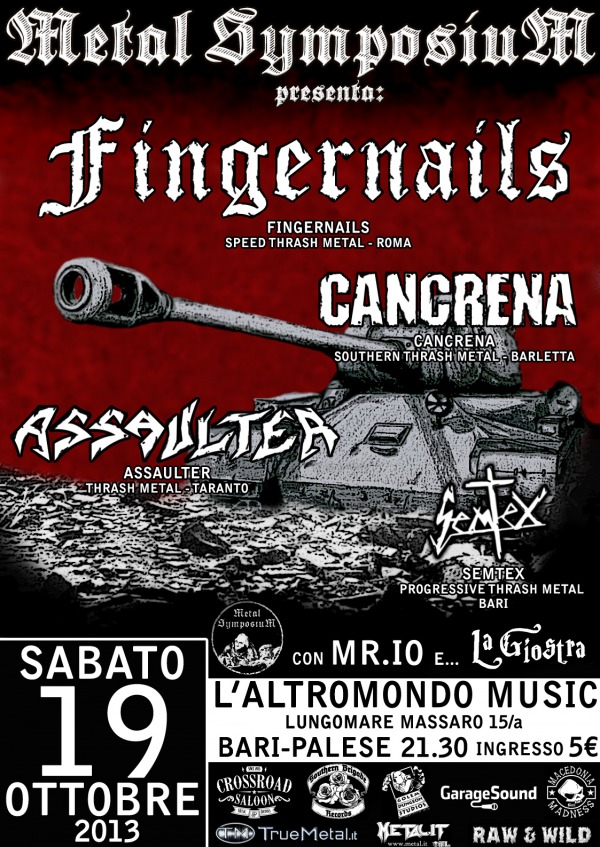 Lo Staff del MS è lieto di annunciare l’arrivo del cingolato dei FINGERNAILS. I veterani nel metal tricolore e gli amanti del puro Underground sanno di chi stiamo parlando. Il panzer sventola bandiera romana e da oltre 30 anni lancia missili discografici e marcia senza sosta sulle macerie di club e festival di tutta l’Europa, seminando caos e sollevando teste impazzite a suon di Speed Thrash Metal. L’ultima volta che il cingolato si è avvicinato alla Puglia è stato in occasione dell’Armageddon in The Park 2011, assieme all’armata Vader e Gama Bomb, molti se lo ricorderanno. Un nuovo album celebrativo è alle porte ed è giunto il momento di presentare la bomba proprio a Bari!