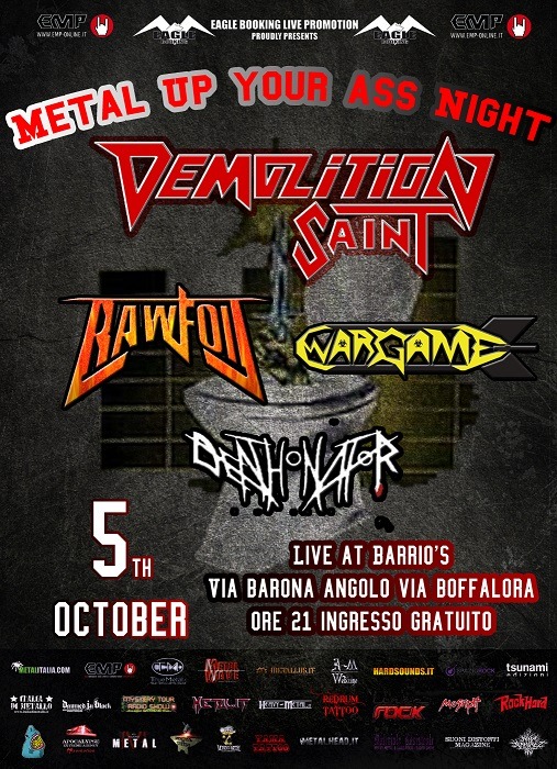 Sabato 5 Ottobre 2013 è di scena l’Underground Italiano, quello vero incondizionato e spinto dalla pura passione. Troveremo infatti ben quattro band a calcare le assi del Barrio’s Cafè durante il “METAL UP YOUR ASS PARTY”: DEMOLITION SAINT, RAWFOIL, WARGAME, DEATHONATOR.