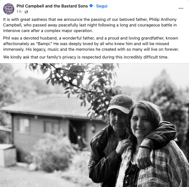 “È con grande tristezza che annunciamo la scomparsa del nostro amato padre, Philip Anthony Campbell, che si è spento serenamente ieri sera dopo una lunga e coraggiosa battaglia in terapia intensiva, a seguito di un complesso e importante intervento chirurgico.