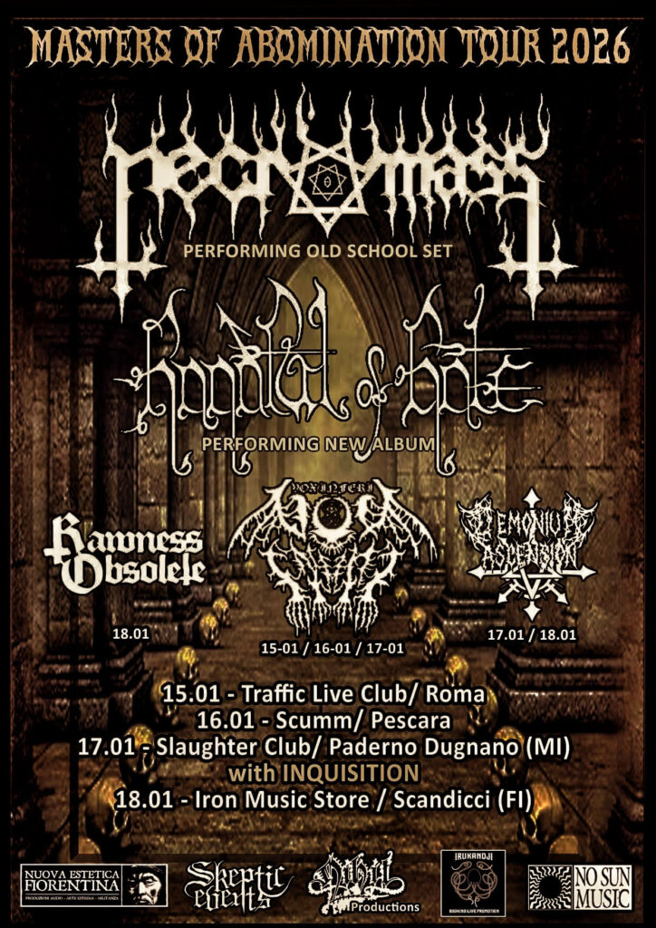 La storica band fiorentina Necromass farà diverse date in giro per l’Italia. Per l’occasione la band proporrà un old school set per tutti gli amanti del Bblack Metal più viscerale e underground, pescando da una discografia che ha le radici nel lontano 1992.
