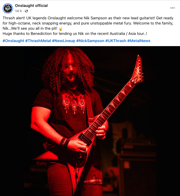 Gli inglesi Onslaught hanno dato il benvenuto tramite i social a Nik Sampson come il loro nuovo chitarrista , così come riportato nel post sulla pagina ufficiale Facebook della band.