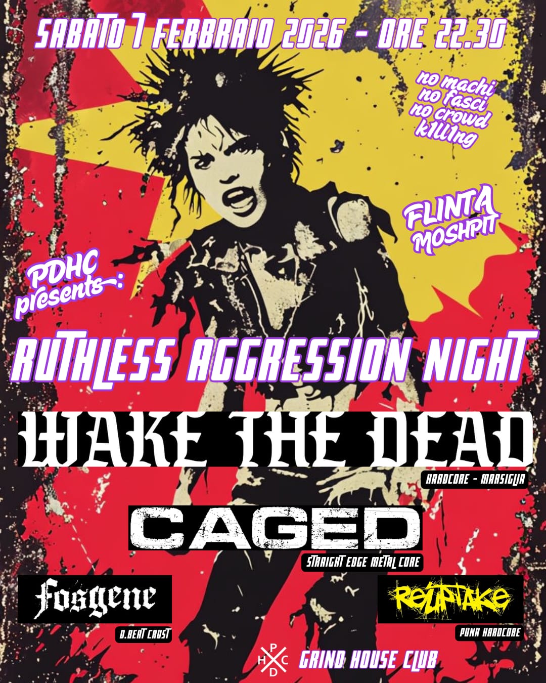 Amicx, compagnx, sorelle vi aspettiamo al Grind House club per una altra serata hardcore punk all’insegna del “no mercy” e dell’aggressione musicale nella maniera più spietata che potete immaginare.