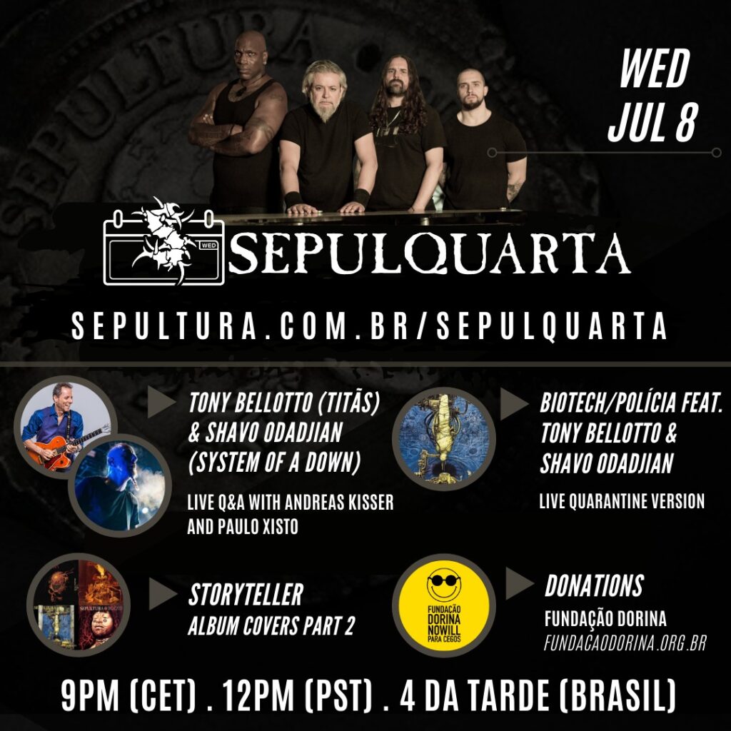 Andreas Kisser commenta: “Abbiamo un altro fantastico episodio di SepulQuarta per voi! Questa volta Tony Bellotto e Shavo Odadjian saranno gli ospiti del nostro botta e risposta e suoneranno anche ‘Biotech Is Godzilla’ e ‘Polícia’. Tony è un caro amico, nonché compositore di ‘Polícia’, una canzone che abbiamo suonato in tutto il mondo. Conosciamo Shavo dal primo tour dei SYSTEM OF A DOWN nel 1998, in apertura agli SLAYER e ai SEPULTURA in Europa. È stato una bomba! Mercoledì non perdetevi SepulQuarta”.