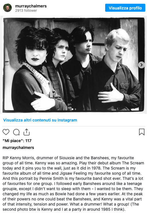 “Riposa in pace Kenny Morris, batterista dei Siouxsie and the Banshees, il mio gruppo preferito di sempre. Kenny era semplicemente incredibile. Ascoltate oggi il loro album di debutto, “The Scream”: vi inchioda al muro proprio come fece nel 1978. “The Scream” è il mio disco preferito in assoluto e “Jigsaw Feeling” la mia canzone del cuore. E questo ritratto di Pennie Smith è la mia foto preferita di una band mai scattata. Sono un sacco di “preferiti” per un solo gruppo.