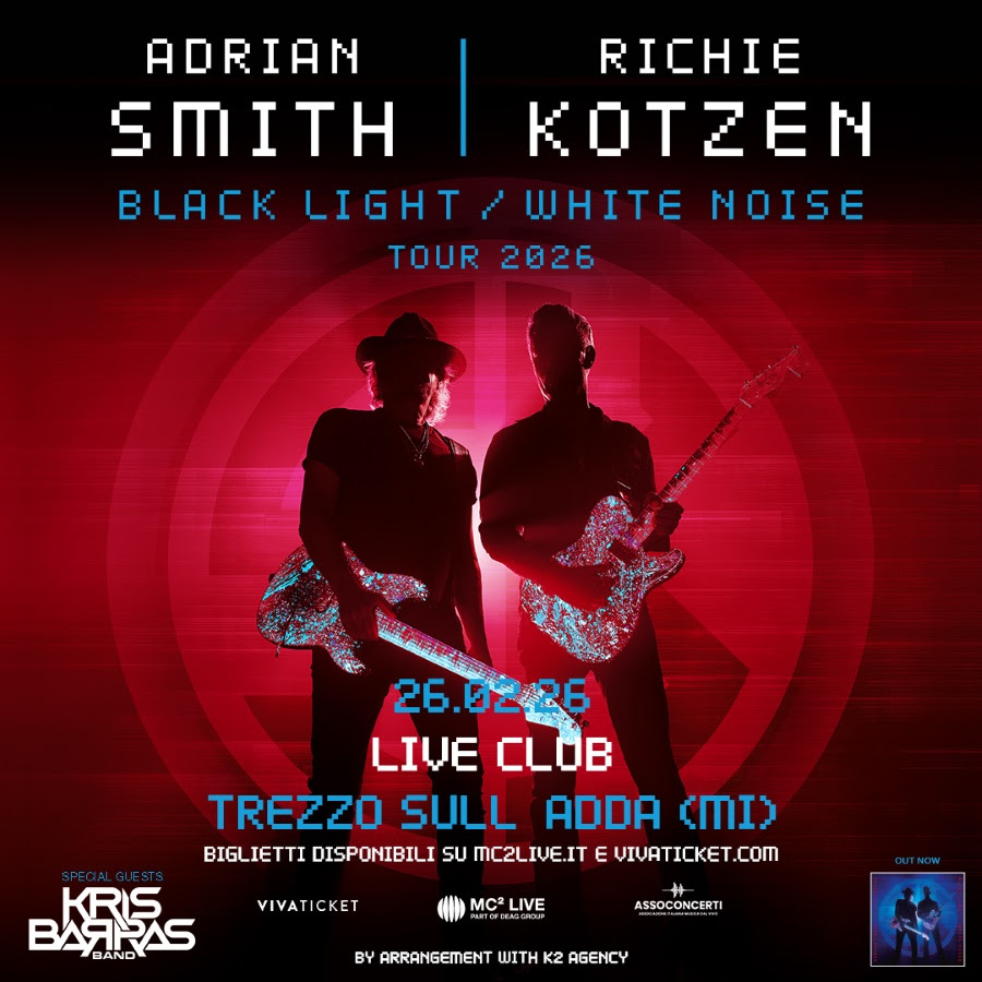 Mancano dieci giorni al ritorno in Italia di Smith/Kotzen, band formata dal virtuoso Richie Kotzen e dal chitarrista degli Iron Maiden Adrian Smith. I due si presenteranno il 26 febbraio 2026 sul palco del Live Club di Trezzo sull’Adda (MI) per l’unico appuntamento nazionale interno al loro Black Light/White Noise Tour 2026.