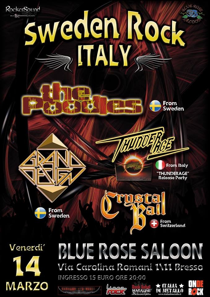 Grande appuntamento al Blue Rose Saloon di Bresso!!! La Rocker Sound Agency presenta lo “SWEDEN ROCK ITALY” Gli Headliner saranno gli svedesi The Poodles formatosi nel 2006 con le loro influenze Hard and Heavy daranno vita ad un esibizione di grande energia dopo essersi esibiti in Festival importanti in giro per l’Europa; prima di loro ci saranno i connazionali Grand Design con le loro influenze più leggere che ogni tanto possono far ricordare i mitici Def Leppard;Poi toccherà ai milanesi Thunderage (gia sul palco con vari artisti del livelli di Jeff Scott Soto) con la presentazione del nuovo disco con l’omonimo nome.Per primi ci saranno gli svizzeri Crystal Ball che accompagnerano gli headliner in giro per l’europa..che dire…NON MANCATE A QUESTA MAGNIFICA SERATA!!!!!!!!!!!!!!