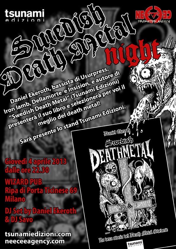 Tutti coloro che desiderano una copia autografata di SWEDISH DEATH METAL ma non potranno partecipare agli eventi del 4 aprile (Santeria e Wizard Pub, Milano), possono ordinarla sul sito Tsunami a questo indirizzo specificando che dedica vorrebbero sul libro. Noi le faremo firmare a Daniel Ekeroth e ve le spediremo il giorno dopo.