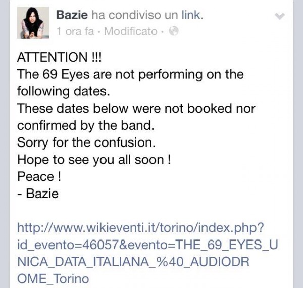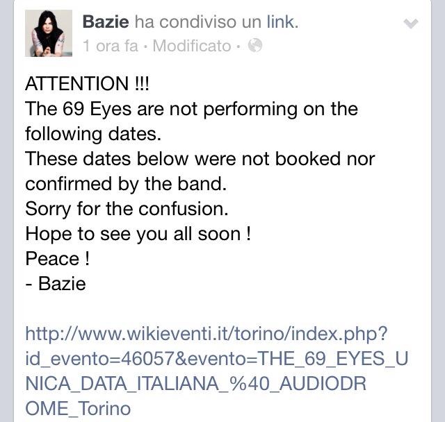 Il chitarrista dei THE 69 EYES – Bazie – ha annunciato attraverso la propria pagina Facebook che alcune date, confermate da diversi promoters e locali, in realtà non sono state confermate dalla band.