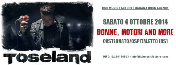 Il due volte campione del mondo di Superbike, TOSELAND, dopo essersi ritirato dal motociclismo a causa di un infortunio al polso, ha deciso di intraprendere la carriera di musicista, riscuotendo da subito enormi consensi e successi! Dopo aver preso parte come supporter unici nel tour dei Reef e degli Status Quo, oltre che di Michael Monroe per le date italiane, il gruppo inglese è ora pronto a calcare i palchi per alcuni show da headliner, che vedranno protagonista James e i suoi musicisti in Italia in occasione di questo unico appuntamento a Castegnato/Ospitaletto in provincia di Brescia il prossimo ottobre.