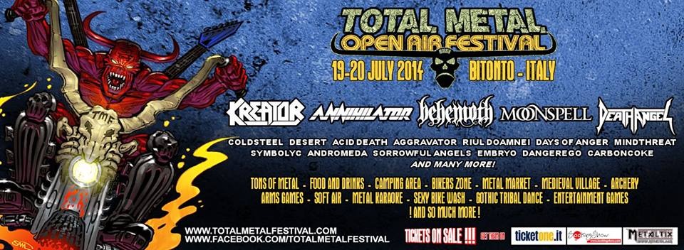 E’ dunque palesemente chiaro ormai che il 19 e 20 luglio 2014, nella città di Bitonto, nel mezzo della soleggiata Puglia, avrà luogo un evento che assumerà un’importanza epocale per lo sviluppo della scena Heavy Metal del Sud Italia! Con questa strabiliante edizione, infatti, il TMF si innalza a testa alta nel panorama dei migliori festival Heavy Metal del Bel Paese offrendo non solo una abbondante manciata di band di fama mondiale, ma anche tantissime altre realtà musicali provenienti praticamente da ogni angolo del mondo come gli americani COLDSTEEL e AGGRAVATOR, gli israeliani DESERT, i greci ACID DEATH,SORROWFUL ANGELS e MINDTREATH, gli svedesi DAYS OF ANGER, gli italiani RIULDOAMNEIDANGEREGOSYMBOLYCANDROMEDACARBONCOKEEMBRYO e tantissime altre band che annunceremo nei prossimi mesi per un totale di quasi 40 gruppi musicali in due interi giorni di festival!