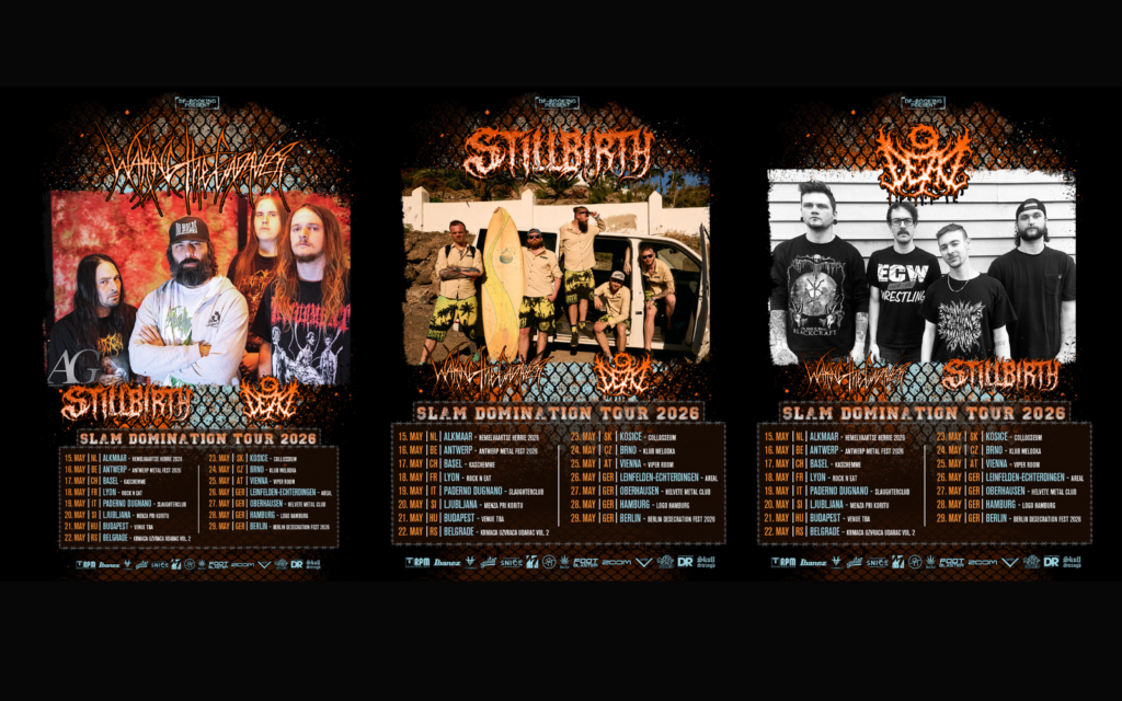 re nomi provenienti da diversi angoli della musica estrema si uniranno per un intero tour europeo a maggio 2026. I Waking The Cadaver (USA), gli Stillbirth (Germania) e i 9Dead (USA) porteranno lo Slam Domination Tour 2026 tra club e festival di 12 paesi, un tour concepito per breakdown, blastbeat e set pesantissimi dall’inizio alla fine.