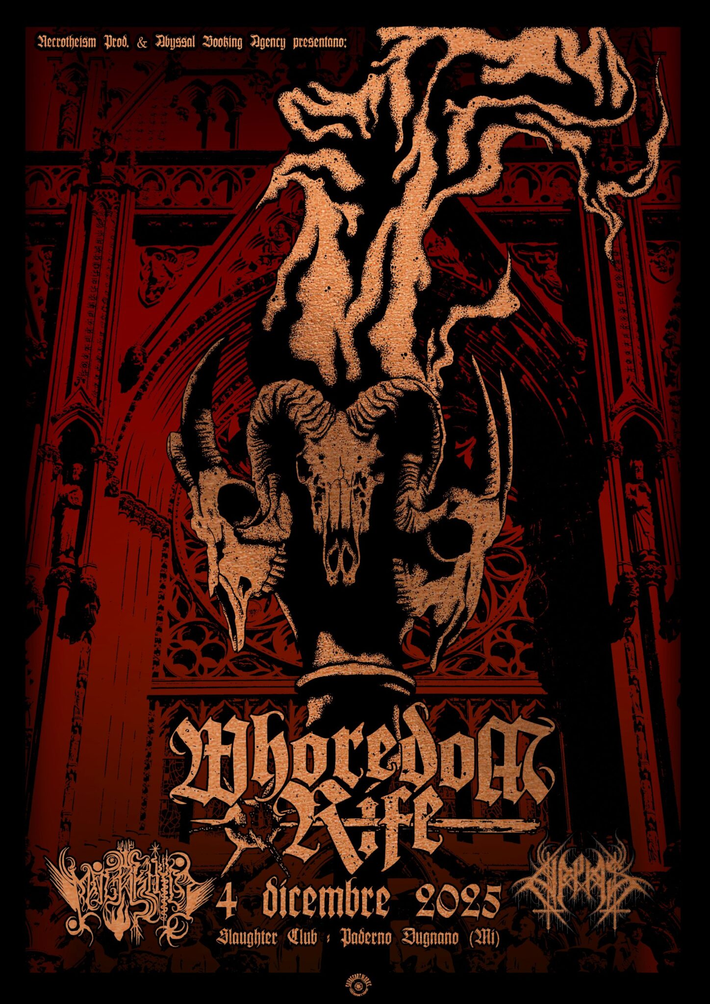 Necrotheism Prod. comunica gli orari ufficiali dell’unica data italiana dei Whoredom Rife, in programma Giovedì 4 Dicembre 2025 allo Slaughter Club di Paderno Dugnano (MI).