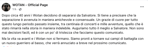 “Dopo circa 40 anni i Wotan decidono di separarsi da Salvatore. Si tiene a precisare che la separazione è avvenuta in maniera amichevole e consensuale. Un grazie di cuore per tutto questo lungo periodo passato insieme, tra centinaia di concerti e mille avventure, quello che è stato rimarrà nella storia in maniera indelebile. Auguriamo tutto il meglio a Salvatore. Non sono mai decisioni facili, ed è con un po’ di tristezza che facciamo questo comunicato.