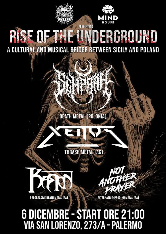 Il 6 dicembre gli XENOS AD saranno i co-headliner, unitamente ai polacchi SEMPRAH, della nuova edizione del “Rise of the Underground” Metal Fest, evento organizzato dalla VOV Eventi che si terrà presso il Mind House di Palermo.