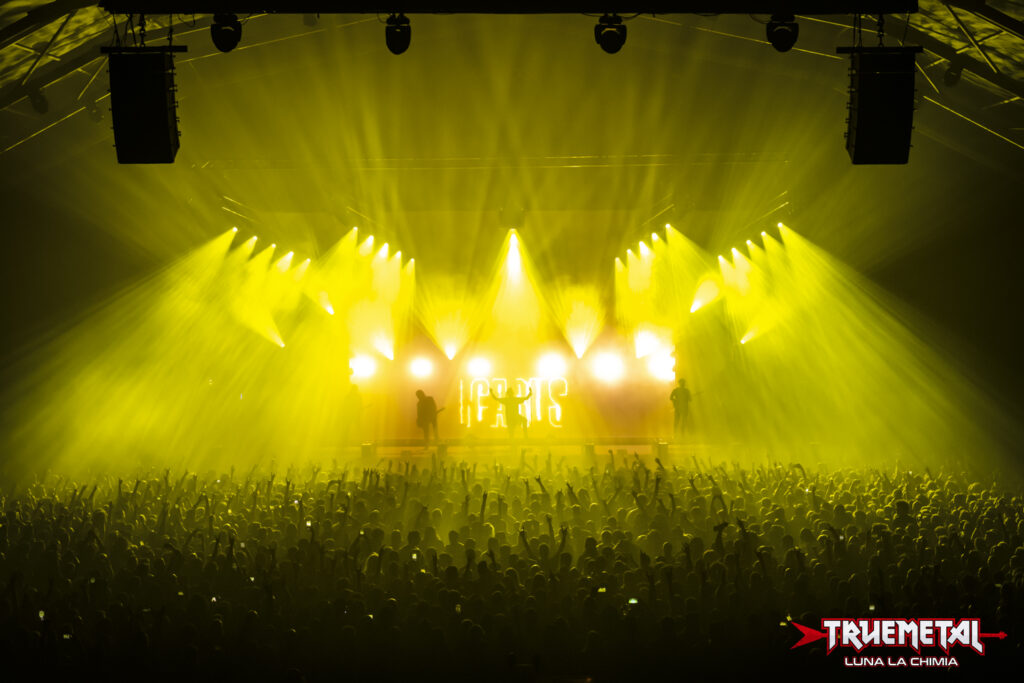 Dopo un rapido cambio palco, le luci di un Geox ormai stracolmo si spengono di nuovo alle 19:10. Il pubblico esplode in un boato e accoglie l’ingresso in scena degli Shadow of Intent. Il cambio di atmosfera è repentino, dato che il sound del quartetto americano è un melodic deathcore molto muscolare e abrasivo, impreziosito da inserti sinfonici. La scaletta è praticamente incentrata sull’ultima fatica “Imperium Delirium”, pubblicata nell’estate 2025, la cui copertina svetta nel backdrop dietro la batteria. Considerando la posizione in serata, i suoni appaiono ben bilanciati e risultano decisamente più puliti rispetto alla band d’apertura. D’altronde, la proposta è completamente diversa e negli Shadow of Intent bisogna valorizzare il lavoro di Chris Wiseman alla chitarra, autore di una prova davvero convincente. Letteralmente terremotante la prestazione di Bryce Butler alla batteria. La scena è però dominata da Ben Duerr, un frontman che sa aizzare la folla e che sa aggredire lo stage con la dovuta dose di adrenalina. La performance degli Shadow of Intent è un vero e proprio pestaggio sonoro. Il pubblico apprezza, eccome. Sorprende però che non vi siano pogo e circle pit in risposta. Piano piano iniziano a prendere vita ripetuti crowd surfing, ma in teatro pare stiano conservando le energie per le band che si esibiranno a breve. Sebbene in sede live i pezzi si rivelino un po’ ripetitivi, il Geox appare sempre più coinvolto dalla prova dei quattro. Nei breakdown tutta la platea scapoccia a tempo e nelle battute conclusive dello show prendono vita ripetuti cori ritmati, per enfatizzare le parti più cadenzate. Duerr dirige a dovere i presenti, dimostrando grande esperienza on stage. Il cantante, inoltre, sfoggia una prova al microfono molto interessante, spaziando in tutto il range vocale di cui dispone. Siamo ormai arrivati alla fine dello show, che viene affidata a ‘The Heretic Prevail’, unico brano pescato dal passato degli Shadow of Intent. L’incedere del pezzo sembra trarre ispirazione dalla dance anni Novanta e non a caso molti dei presenti attorno a noi iniziano a danzare a tempo. Sono le 19:40 quando lo spettacolo del quartetto termina con una chiusura strumentale che poteva essere curata meglio. Un particolare che non può certo penalizzare una prova muscolare e convincente, anche se per originalità la collochiamo un gradino sotto rispetto alla performance degli Humanity’s Last Breath. Per noi, ovviamente. Stando alle reazioni della platea, il Geox la pensa diversamente.