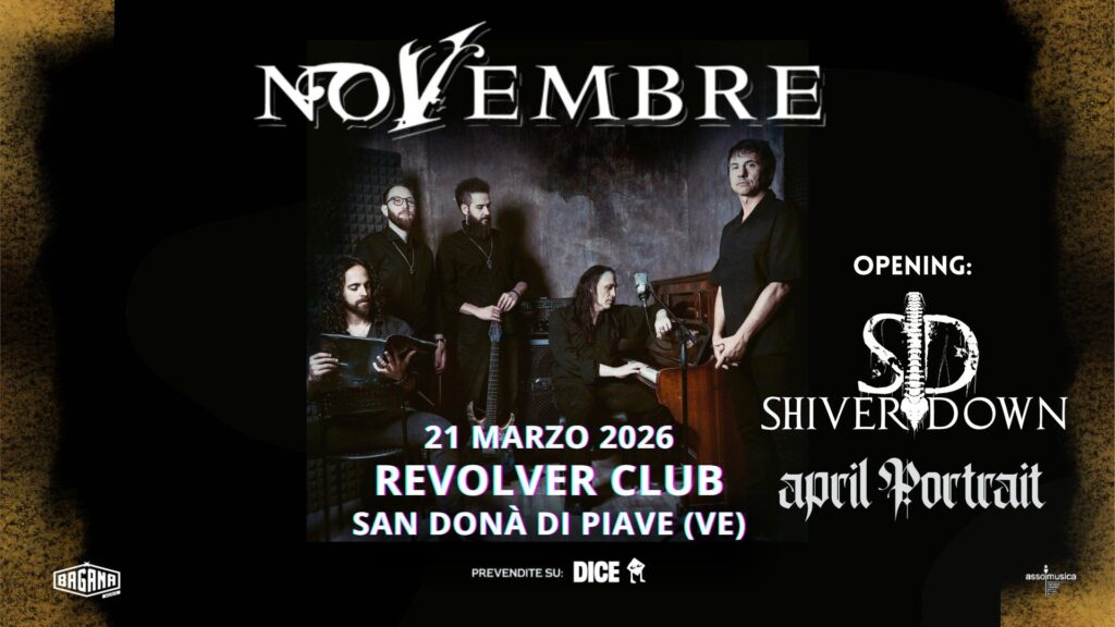 Quasi a fare da contraltare ai colori della primavera, lo scorso sabato 21 marzo i Novembre hanno fatto tappa al Revolver Club di San Donà di Piave. La band capitanata da Carmelo Orlando è in tour per promuovere “Words of Indigo”, lavoro pubblicato sul finire del 2025, a quasi dieci anni dal precedente “Ursa”. Questa nuova avventura live diventa un richiamo imperdibile per gli amanti delle atmosfere decadenti e introspettive, marchio di fabbrica dei Novembre. Se a questo aggiungiamo che ad accompagnare la compagine romana troviamo Shiver Down e April Portrait, due nomi nuovi dell’espressione più malinconica della musica dura, possiamo subito intuire l’importanza della serata. Noi di Truemetal.it non potevamo certo mancare: eccovi il racconto dell’esperienza vissuta al Revolver Club.